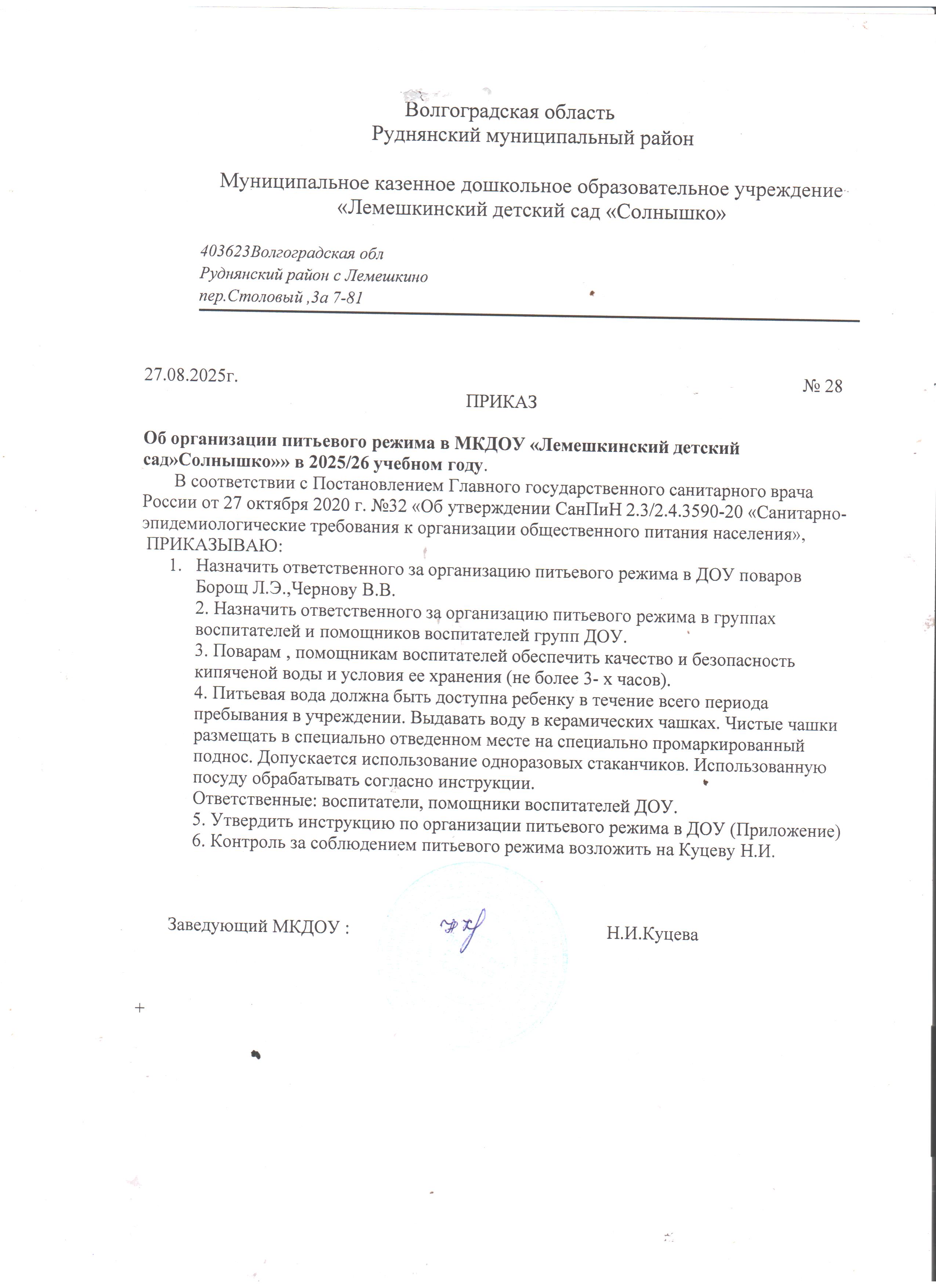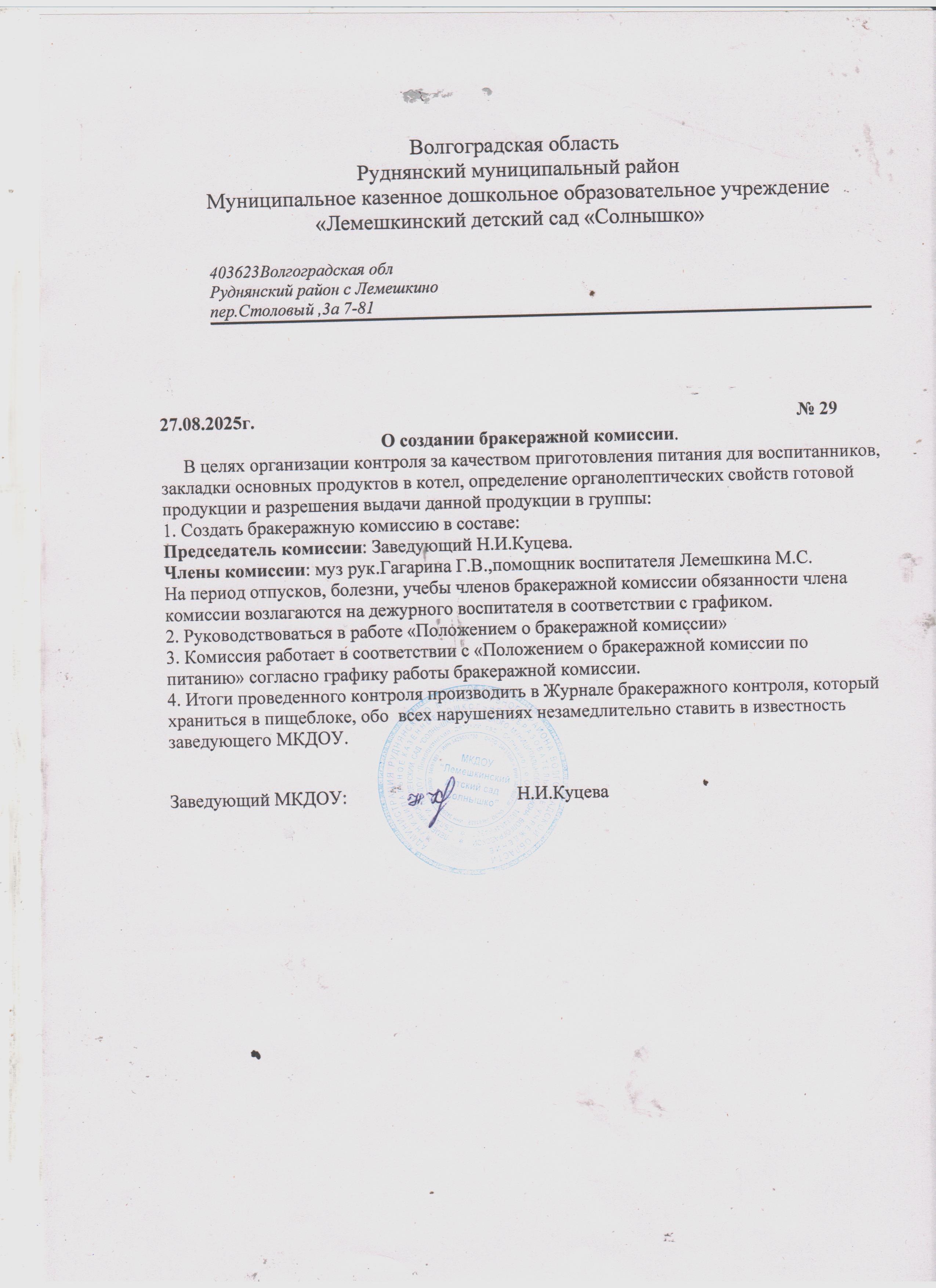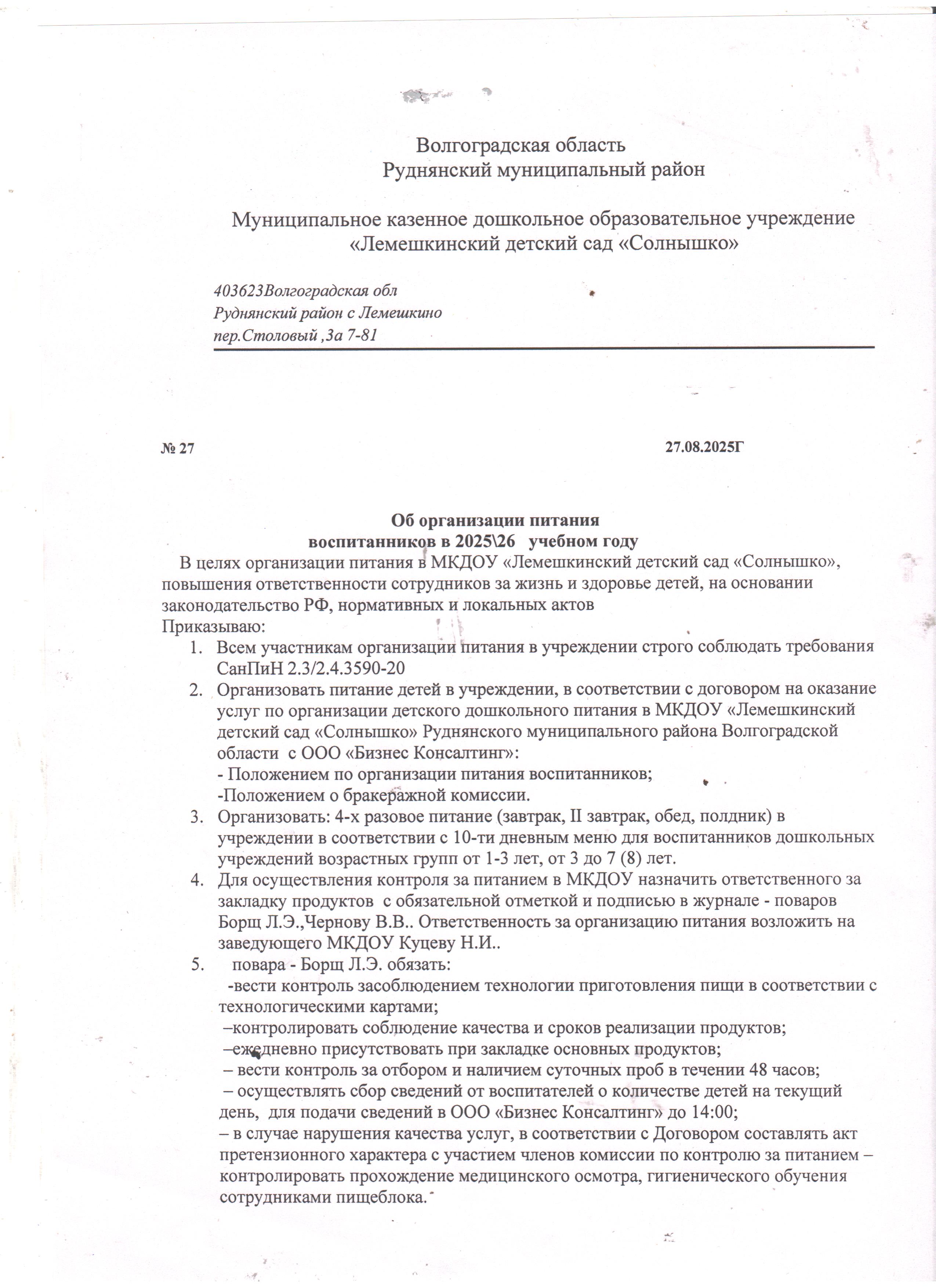 Ответственные за организацию питания в МКДОУ "Лемешкинский детский сад «Солнышко": Куцева Надежда Ивановна - 8(84453)7-81-94